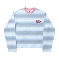 This long sleeve t-shirt from the J'Adore Napoli collection features a boxy fit and a classic white and baby blue stripe design. Made from 100% polyester, it is lightweight and comfortable. The print is done through silkscreen printing, adding a touch of sophistication to the overall look. Perfect for casual wear or dressing up for a night out.