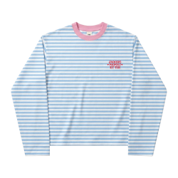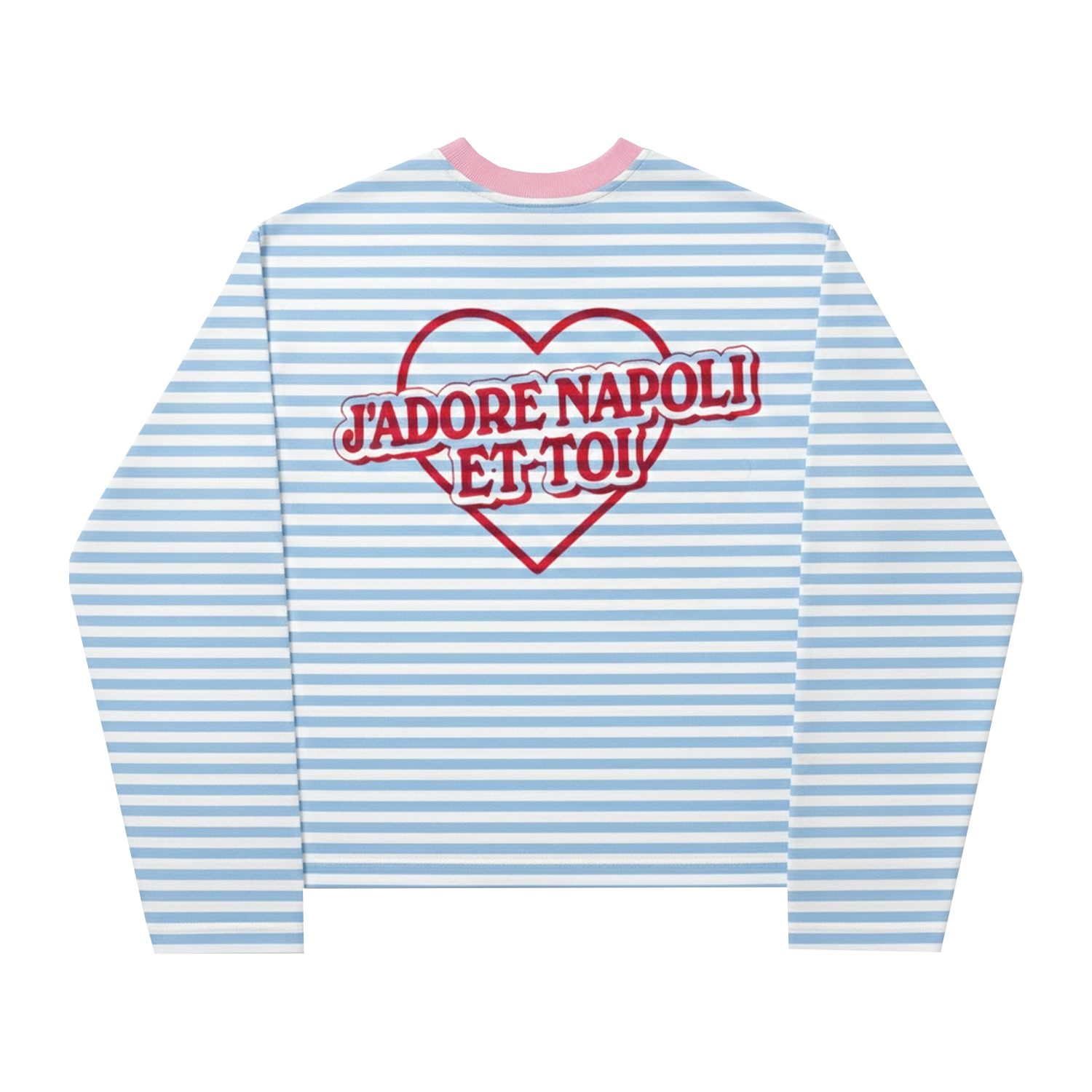 This long sleeve t-shirt from the J'Adore Napoli collection features a boxy fit and a classic white and baby blue stripe design. Made from 100% polyester, it is lightweight and comfortable. The print is done through silkscreen printing, adding a touch of sophistication to the overall look. Perfect for casual wear or dressing up for a night out.